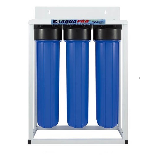 AquaPro Big Blue Jumbo Water Filtration System ( 3 stage) remove chlorine and other chemical tastes, odours plus dirt, sediments, making water cleaner, clearer, and safer for your whole house. In addition, they also protect your appliances, fixtures and pipelines. AquaPro Big Blue Jumbo Water FIltration System are usually placed in the main water line entering the home and generally have capacities to filter 10,00 – 100,00 gallons of water before you have to change the cartridge.Heavy duty Big Blue Jumbo Water Filtration System with pressure relief valve NSF certified materials.